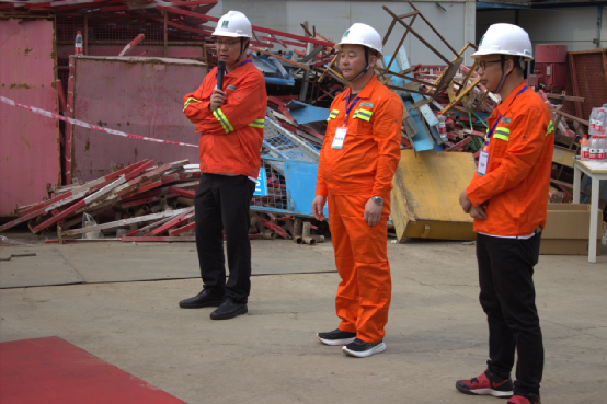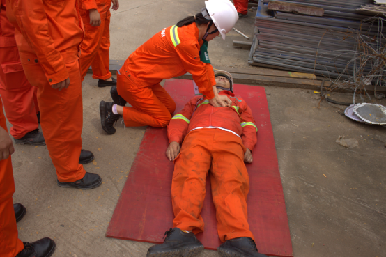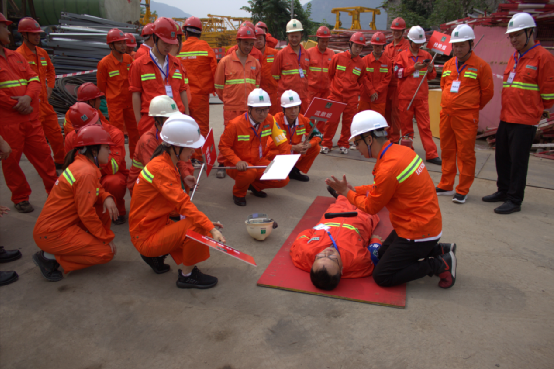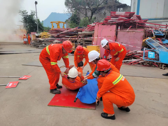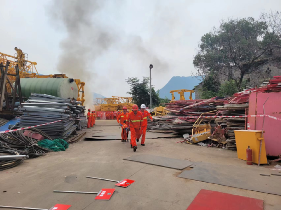 伴隨著緊急警報聲響起,演練正式開始。本次演練活動由西部區域運營總監羅建擔任總指揮,四川分公司經理楊春強擔任副總指揮,施工現場濃煙四起,通訊組馬上向副總指揮報告施工現場起火,副總指揮向總指揮上報現場情況,總指揮馬上下達啟動應急預案機制;疏散組已將現場拉起警戒線,同時現場群眾在安全員的指揮下迅速按消防預案的疏散線路有序拿起濕毛巾或消防防毒防煙面罩,小步快走,迅速且有序撤離現場。同時現場傷員通過心肺復蘇等方法也得到緊急救治并交給120;火情也在大家的共同努力下被有效控制。